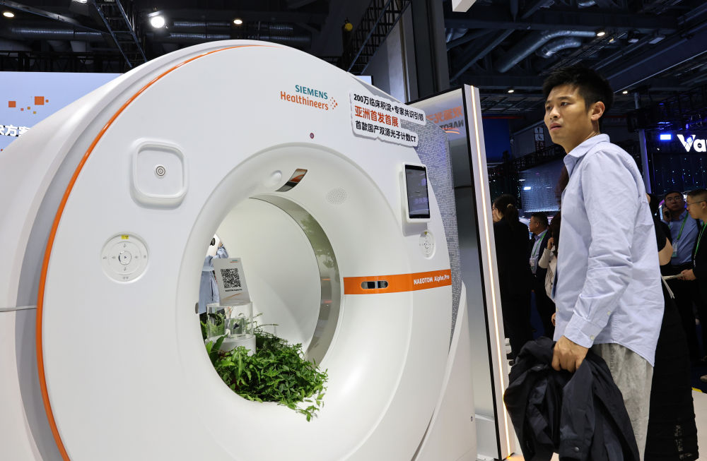 2025年11月6日,參觀者在第八屆進(jìn)博會醫(yī)療器械及醫(yī)藥保健展區(qū)西門子醫(yī)療展臺駐足觀看一款亞洲首發(fā)首展的CT機(jī)展品。進(jìn)博會是全球新品首發(fā)地,更被視為前沿技術(shù)“首秀地”。