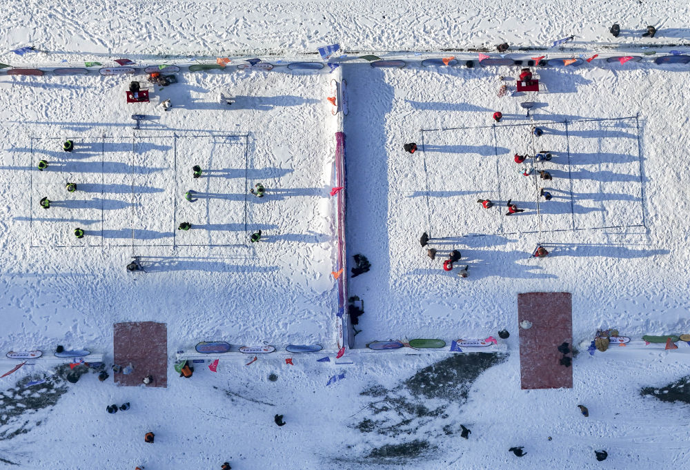 2025年12月25日,人們在第八屆哈爾濱松花江冰雪嘉年華園區(qū)內體驗冰上排球(無人機照片)。本屆冰雪嘉年華推出近60項特色項目,為市民與游客打造多樣化的冰雪體驗。