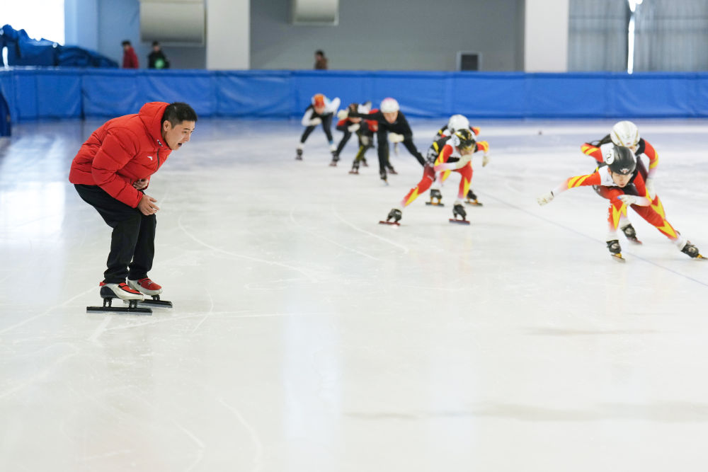 2025年1月24日,短道速滑教練姚忠華(左)在黑龍江省七臺河市短道速滑館指導運動員進行冰上訓練。十余年來,姚忠華累計執(zhí)教培養(yǎng)過200余名運動員。七臺河市擁有“奧運冠軍之城”的城市名片,在這里,教練員們一起筑夢冰場,為我國冰雪人才的儲備奉獻自己的力量。