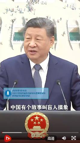 儀式結(jié)束后,習(xí)主席在對(duì)使節(jié)們發(fā)表講話時(shí),講到一則“盲人摸象”的寓言故事。習(xí)主席說:“象很大,如果是一個(gè)盲人,他摸到一條腿,就說象是一個(gè)柱子,摸到肚子,就說象是一堵墻,但實(shí)際上不是完整的象。”