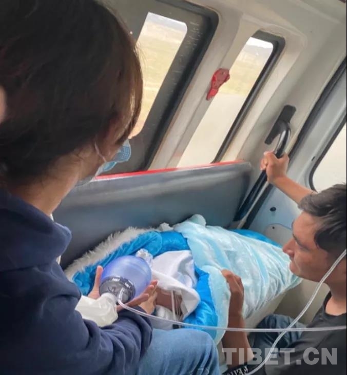 路途的顛簸及病情的反復(fù),患兒在面罩吸氧下血氧飽和度下降至50-60%,呼吸急促、體溫達到39.9℃,并再次出現(xiàn)軀體抽動。醫(yī)務(wù)人員在轉(zhuǎn)運途中對患兒加大氧流量并改為持續(xù)球囊壓迫給氧,加強物理降溫,繼續(xù)予升壓、抗感染、補液等處理,患兒的體溫較前下降,但血氧飽和度仍然不穩(wěn)定,心率波動大,數(shù)次下降至90次/分以下,一度出現(xiàn)室性心律,醫(yī)務(wù)人員數(shù)次給予各項強心、轉(zhuǎn)律、吸痰等搶救措施,并繼續(xù)持續(xù)球囊壓迫給氧加強氧合。如此反復(fù),一路救治,患兒和醫(yī)務(wù)人員終于在次日凌晨一點二十分,抵達西藏自治區(qū)人民醫(yī)院。