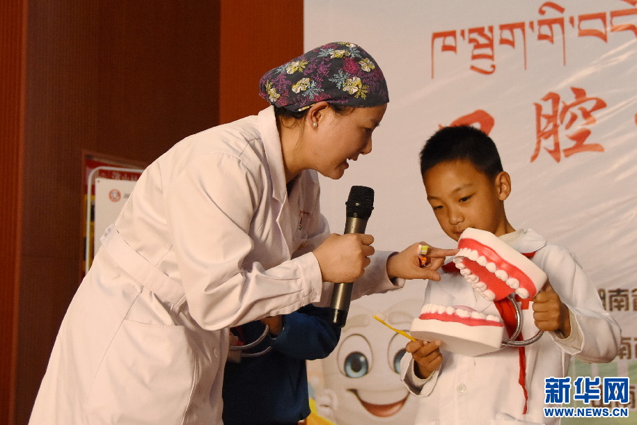 在一個不大的小學禮堂,“均衡飲食限糖減酸,潔白牙齒燦爛微笑”的條幅懸掛在兩邊,數(shù)百名小學生和家長共同聽臺上的援藏醫(yī)生講解口腔衛(wèi)生知識,時不時流露出恍然大悟的神情……