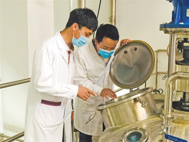 仁增(左一)和同事正在查看提取罐中的藏藥浴藥材?! ?/p>