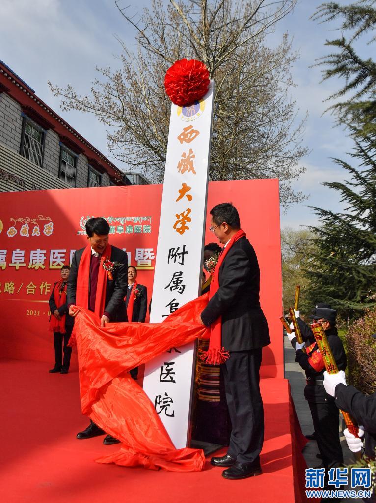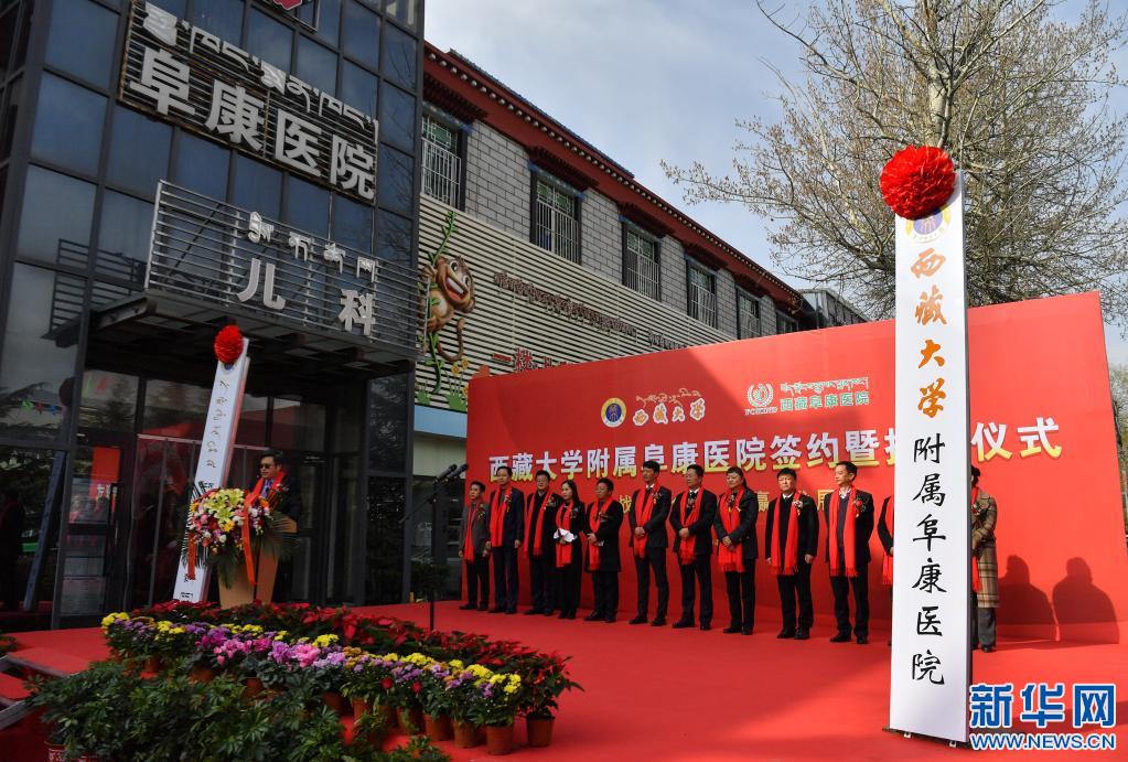 西藏大學(xué)附屬阜康醫(yī)院簽約暨揭牌儀式現(xiàn)場(4月7日攝)。