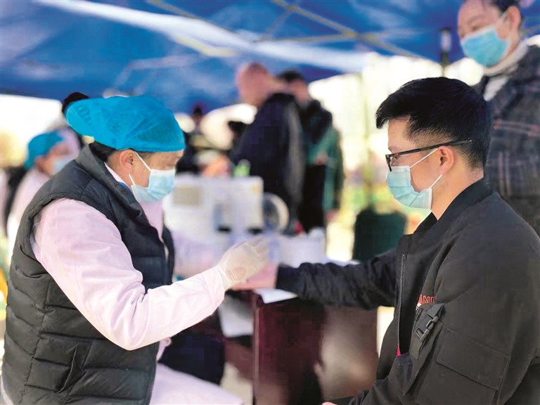 圖為醫(yī)護(hù)人員為獻(xiàn)血者檢測(cè)血液。(拉薩融媒視覺(jué)組攝)