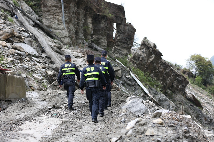 圖為屈鵬帶領(lǐng)所屬民警在口岸泥石流地段進(jìn)行巡邏