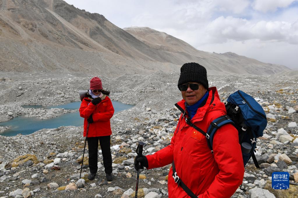 朱彤和科研人員在珠峰登山大本營(yíng)和絨布冰川間徒步穿梭(5月1日攝)。新華社記者 姜帆 攝