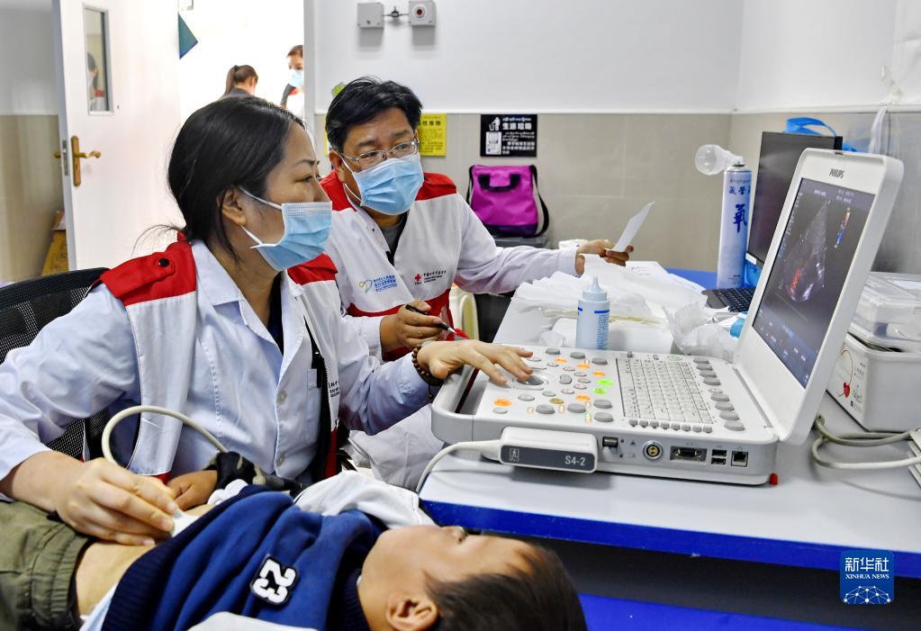 7月9日,在西藏山南市浪卡子縣人民醫(yī)院,來(lái)自鄭州市第七人民醫(yī)院的主任醫(yī)師張潤(rùn)生(右)和彩超室主任于慧娟(左)在為一名兒童做檢查。新華社記者 張汝鋒 攝