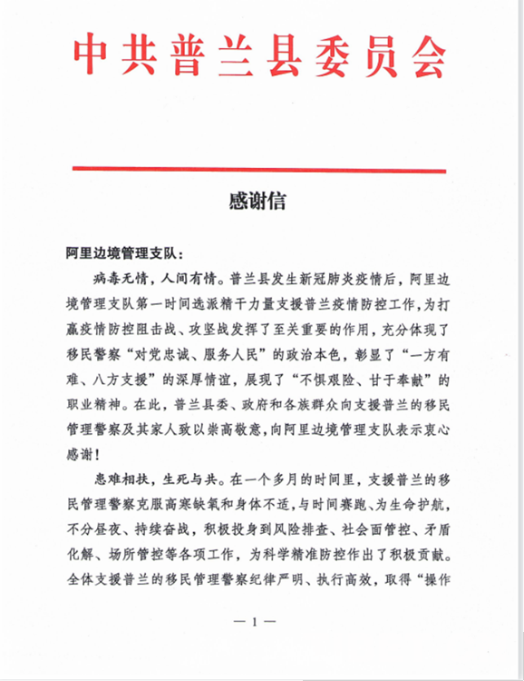 共抗疫情,感謝你們!這是一封來自普蘭縣委的感謝信