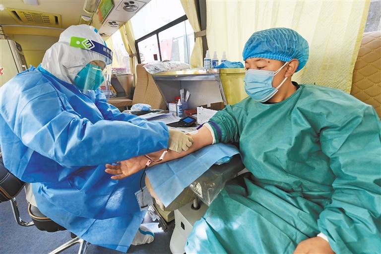 近日,西藏自治區(qū)無(wú)償獻(xiàn)血委員會(huì)向全區(qū)各級(jí)黨政機(jī)關(guān)、企事業(yè)單位、民間社會(huì)組織和社會(huì)各界愛(ài)心人士發(fā)出《致全區(qū)人民無(wú)償獻(xiàn)血倡議書(shū)》, 西藏各族各界干部群眾積極響應(yīng),踴躍參與無(wú)償獻(xiàn)血,奉獻(xiàn)愛(ài)心,傳遞正能量。 圖為醫(yī)護(hù)人員在采集血液。 記者 唐斌 攝
