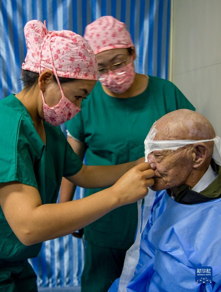6月8日,光明眼科康復(fù)診療院的護(hù)士在為一位農(nóng)牧民白內(nèi)障患者做術(shù)后包扎。新華社記者 姜帆 攝