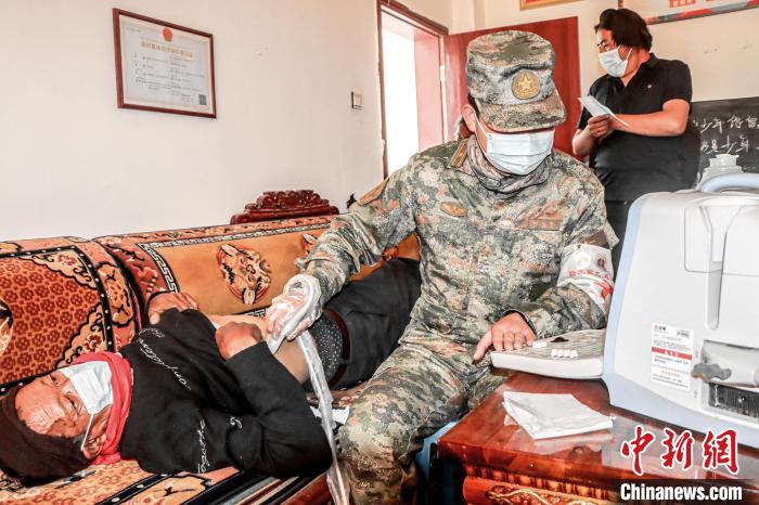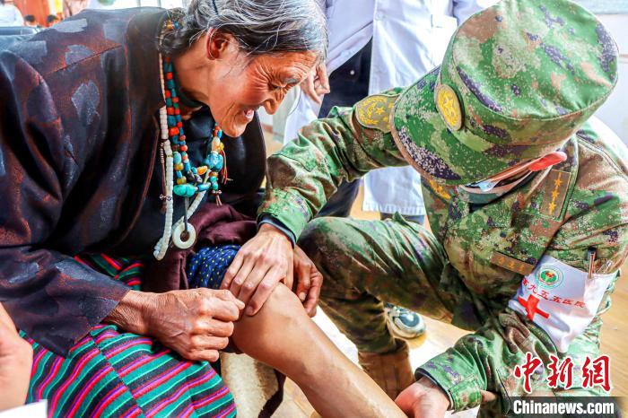 圖為醫(yī)療隊軍醫(yī)來到格桑措姆老人的家中為她檢查膝蓋疼痛問題?!≈煳男?攝