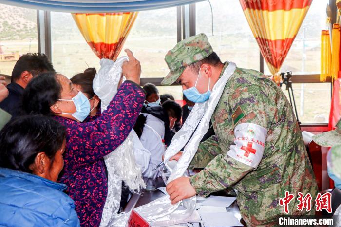 圖為村民紛紛為醫(yī)療隊軍醫(yī)敬獻哈達。 朱文秀 攝