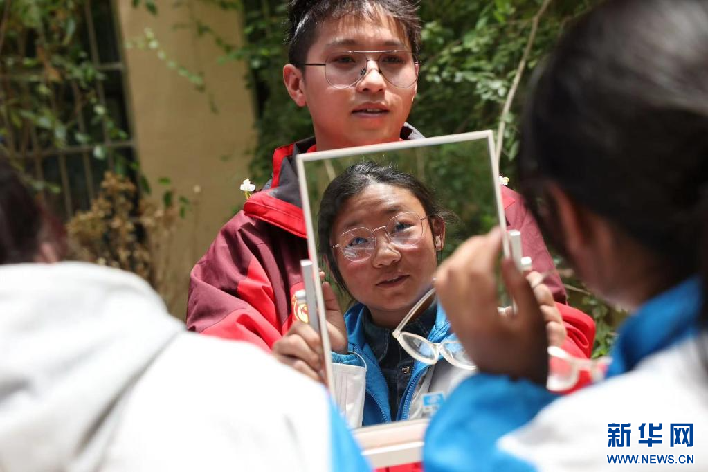 在西藏自治區(qū)那曲市色尼區(qū)第二中學(xué)(杭嘉中學(xué)),志愿者狄璐琬正引導(dǎo)戴上試戴架的學(xué)生適應(yīng)眼鏡清晰度(6月22日攝)。新華社發(fā)(趙穎碩 攝)