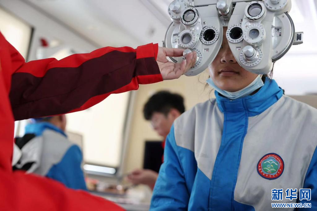 在西藏自治區(qū)那曲市色尼區(qū)第二中學(xué)(杭嘉中學(xué)),志愿者用綜合驗(yàn)光儀為學(xué)生驗(yàn)光(6月22日攝)。新華社發(fā)(趙穎碩 攝)