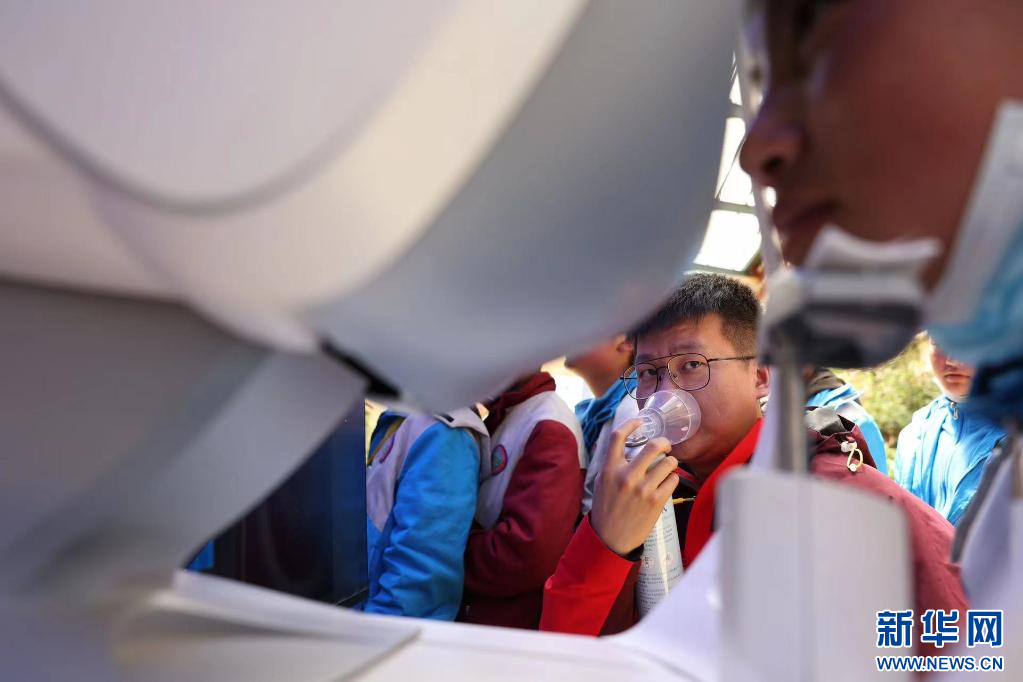 在西藏自治區(qū)那曲市色尼區(qū)第二中學(xué)(杭嘉中學(xué)),志愿者陳坤一邊吸氧一邊為學(xué)生驗(yàn)光(6月22日攝)。新華社發(fā)(趙穎碩 攝)