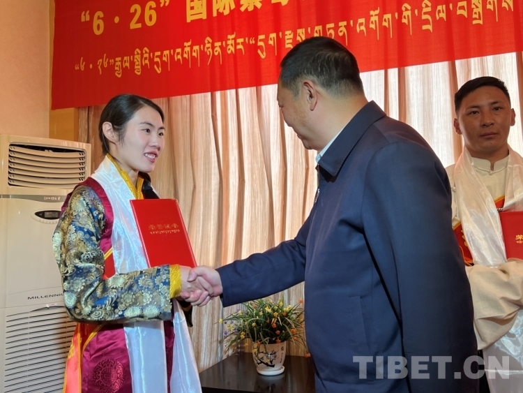 圖為相關領導為西藏禁毒達人頒發(fā)榮譽證書 攝影:德吉卓瑪