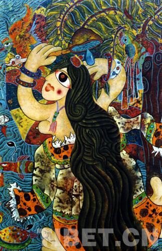 圖為藏族女畫家德珍創(chuàng)作的“沐浴節(jié)”題材畫作攝影:索窮