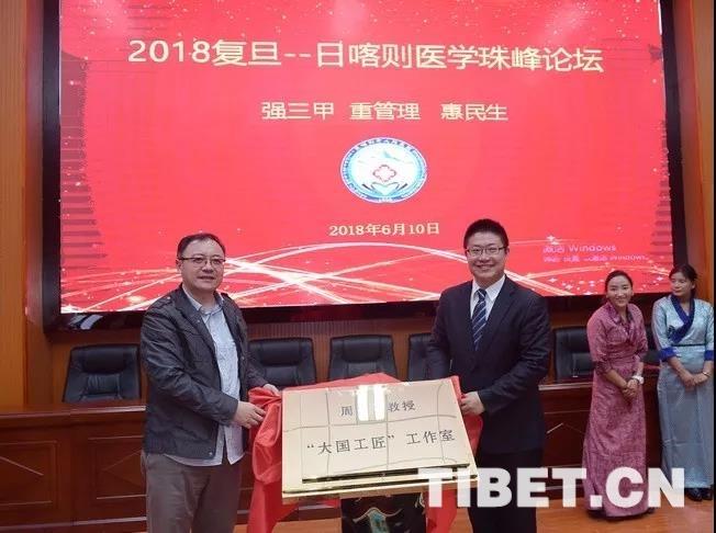 圖為復旦-日喀則醫(yī)學高峰論壇上,日喀則市人民醫(yī)院龍子雯與周平紅教授一同為周平紅-大國工匠工作室掛牌。日喀則市人民醫(yī)院供圖