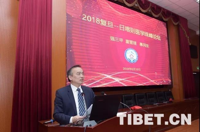 圖為復旦大學黨委副書記袁正宏出席復旦-日喀則醫(yī)學高峰論壇并致辭。日喀則市人民醫(yī)院供圖