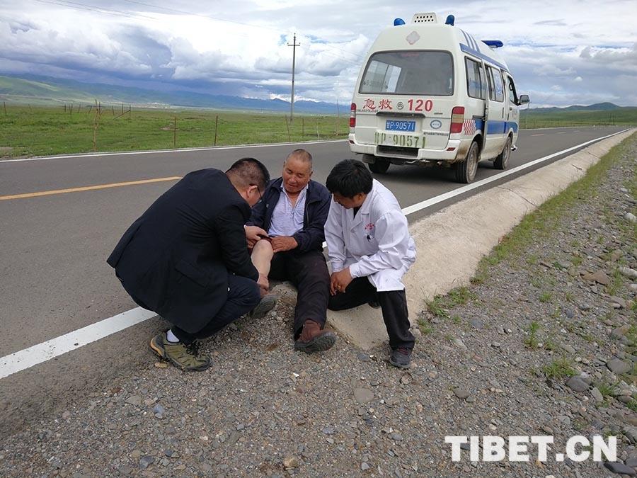 老人說(shuō)自己的膝關(guān)節(jié)總是會(huì)疼,剛才在路邊站了一個(gè)多小時(shí),腫脹疼痛更加嚴(yán)重??吹竭@種情況,來(lái)自北京市昌平區(qū)醫(yī)院的骨科主任王現(xiàn)海立即在公路邊開(kāi)始診治。詢(xún)問(wèn)病史及進(jìn)行體格檢查后,醫(yī)生診斷為右膝關(guān)節(jié)骨性關(guān)節(jié)炎。隨后與歐拉秀瑪鄉(xiāng)衛(wèi)生院院長(zhǎng)楊河軍及其他專(zhuān)家一起將老人抬上救護(hù)車(chē),讓他躺在救護(hù)車(chē)的擔(dān)架上,進(jìn)行了腰椎及髖關(guān)節(jié)的體檢,排除了腰椎及髖部疾患的可能。王現(xiàn)海輔導(dǎo)老人進(jìn)行針對(duì)膝關(guān)節(jié)骨性關(guān)節(jié)炎的康復(fù)鍛煉,建議其口服消炎止痛類(lèi)藥物,并到上級(jí)醫(yī)院進(jìn)一步檢查明確病情。老人連忙稱(chēng)謝。