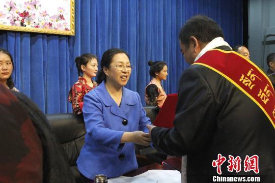 圖為西藏自治區(qū)副主席羅梅向先進(jìn)集體獲得者頒獎(jiǎng)。 趙朗 攝