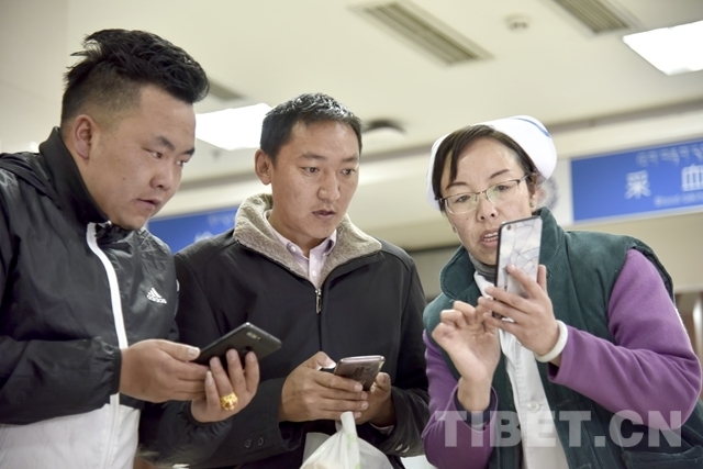 圖為西藏自治區(qū)人民醫(yī)院工作人員正在指導(dǎo)前來就診的群眾使用手機(jī)微信掛號。