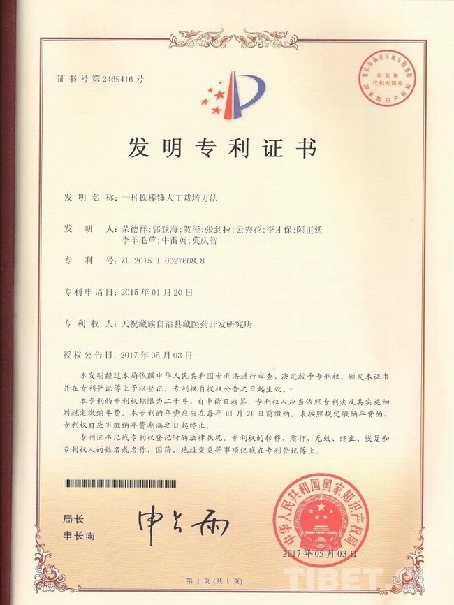 圖為天??h藏醫(yī)藥開發(fā)研究所發(fā)明的“一種鐵棒錘人工栽培方法”獲得了國(guó)家知識(shí)產(chǎn)權(quán)局發(fā)明專利。