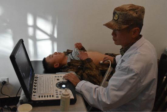聽說陸軍九五六醫(yī)院前來巡診,官兵們早已等候在門外。查體、量血壓、做彩超……醫(yī)療隊(duì)員們耐心地詢問官兵的身體狀況,為每個官兵做詳細(xì)的體檢。