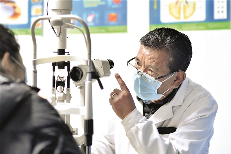 圖為3月24日,西藏拉薩光明眼科康復(fù)診療院醫(yī)生對(duì)白內(nèi)障患者進(jìn)行檢查。記者 覺果 攝