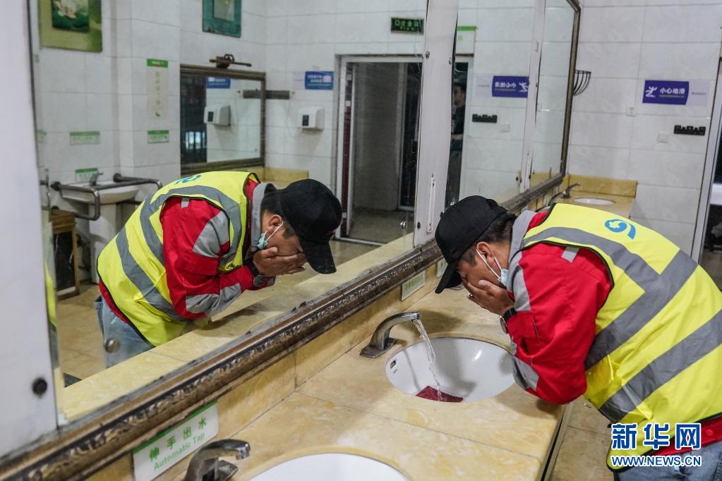 7月20日深夜,在河北保定服務(wù)區(qū)休息時,司機蘆艷會在衛(wèi)生間洗臉。新華社記者 彭子洋 攝