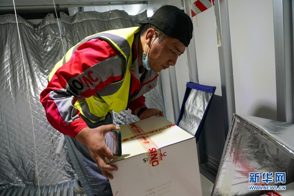 7月22日,蘆艷會在冷鏈車內(nèi)將疫苗搬出,準備交付給四川甘孜州疾控中心。新華社記者 陳鐘昊 攝