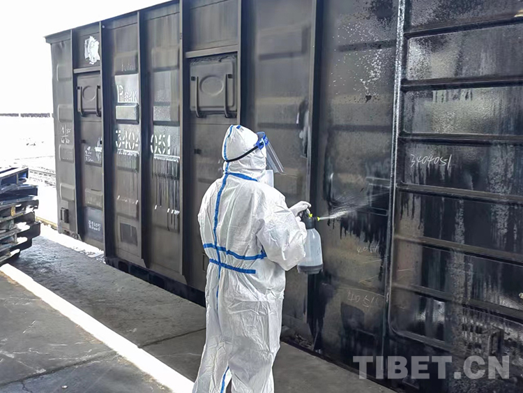 圖為拉薩車務(wù)段工作人員對(duì)到站物資進(jìn)行消殺