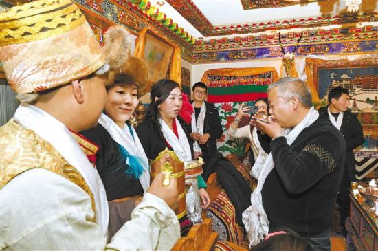 游客們?cè)诶_市城關(guān)區(qū)奪底街道維巴村體驗(yàn)藏歷新年的別樣風(fēng)俗。記者 格桑倫珠 唐斌 攝