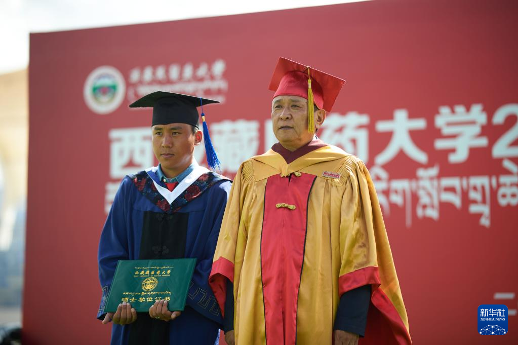6月21日,西藏藏醫(yī)藥大學(xué)校長(zhǎng)、博士生導(dǎo)師米瑪(右)與一名畢業(yè)生合影。新華社記者 旦增尼瑪曲珠 攝