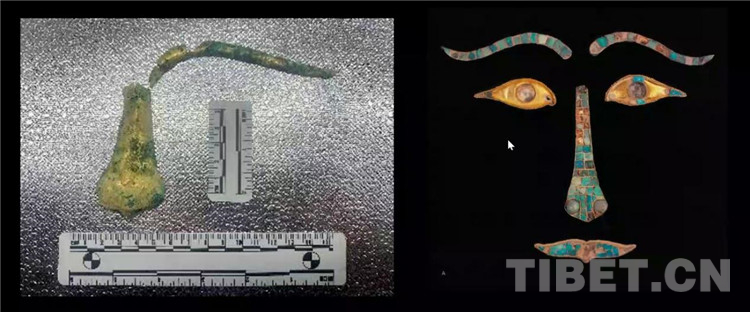 圖為西藏當(dāng)雄吐蕃墓地出土面具殘件與青海都蘭熱水墓群“2018血渭一號(hào)墓”出土面具
