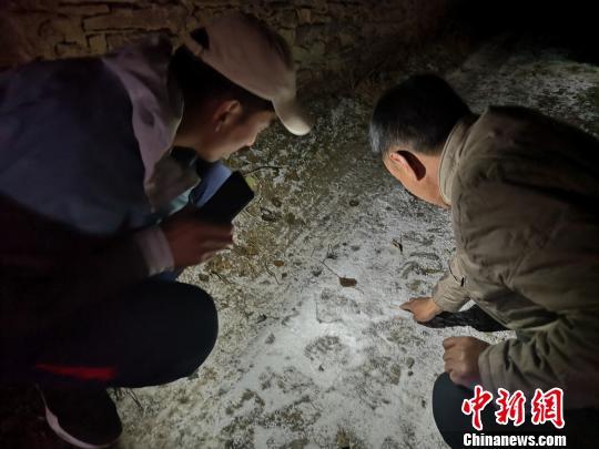 圖為青海省玉樹州稱多縣環(huán)境保護和林業(yè)局工作人員沿雪豹留下的腳印找尋蹤跡。 鐘欣 攝