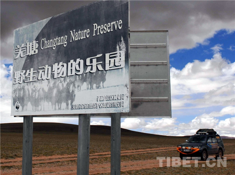 圖為一輛自駕游車輛通過(guò)羌塘國(guó)家級(jí)自然保護(hù)區(qū)的標(biāo)志牌(2009年) 攝影:唐召明