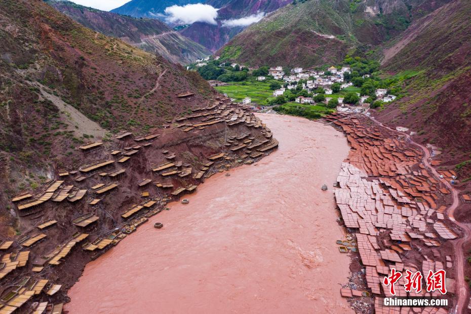 當(dāng)?shù)孛癖娫跒憸娼祥_山鑿井,取出巖層深處含鹽的鹵水倒入鹽田,經(jīng)陽光蒸曬、風(fēng)干,結(jié)晶成鹽。何蓬磊 攝