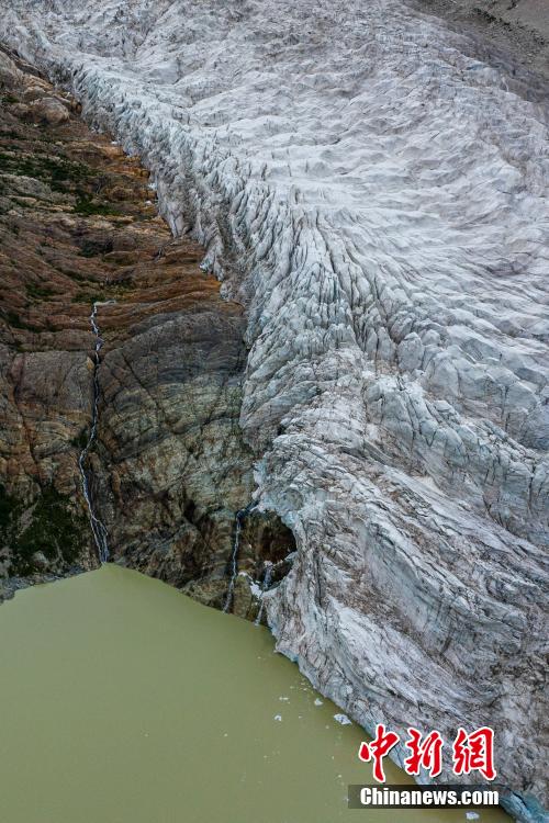 約雄冰川位于西藏自治區(qū)那曲市巴青縣境內(nèi),從空中俯瞰,巨大的冰川宛若一條巨龍,從6328米高的布加雪山峰頂傾瀉奔下,形成懸冰川體,蔚為壯觀。圖為約雄冰川融水形成的約雄措。 何蓬磊 攝