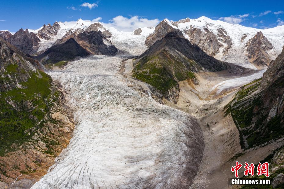 約雄冰川距離巴青縣城約85公里,冰川所在區(qū)域?qū)儆趪?guó)家級(jí)濕地保護(hù)區(qū),主要由冰川下游冰緣區(qū)的湖泊水域、河流、沼澤化草甸及流域匯水區(qū)的部分水源林地組成。圖為航拍約雄冰川。 何蓬磊 攝