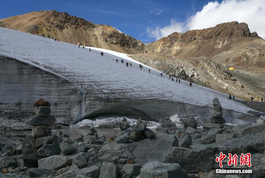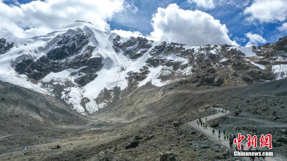 西藏拉薩河谷1號(hào)冰川(廓瓊崗日冰川)景區(qū)將與2021年4月正式全面開放,洛堆峰雪山攀登項(xiàng)目也將正式啟動(dòng)。資料圖為游客在洛堆峰游玩。(無人機(jī)拍攝)中新社發(fā) 貢嘎來松 攝