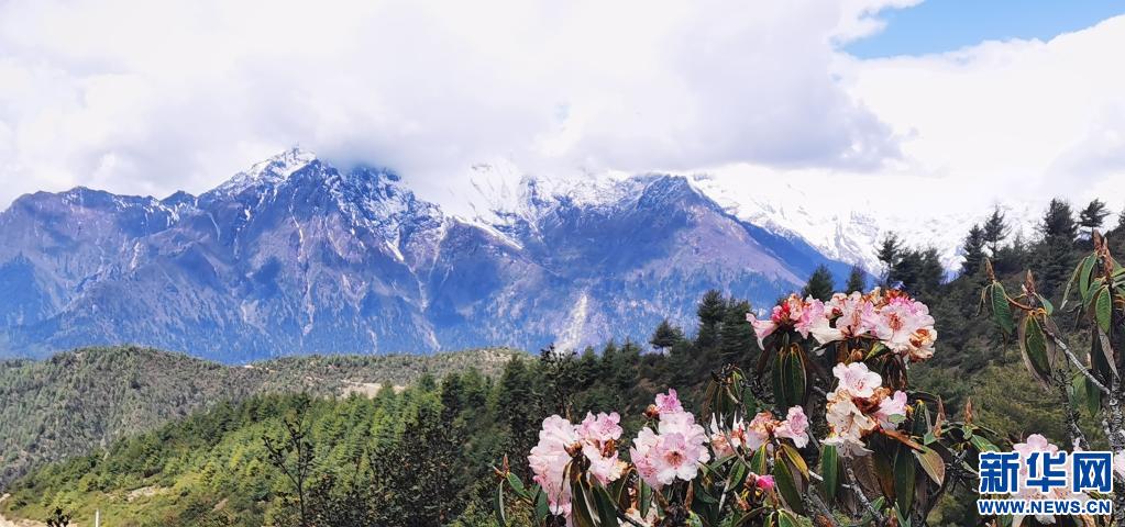 這是5月15日在吉隆溝拍攝的杜鵑花和雪山(手機照片)。新華社記者 沈虹冰 攝