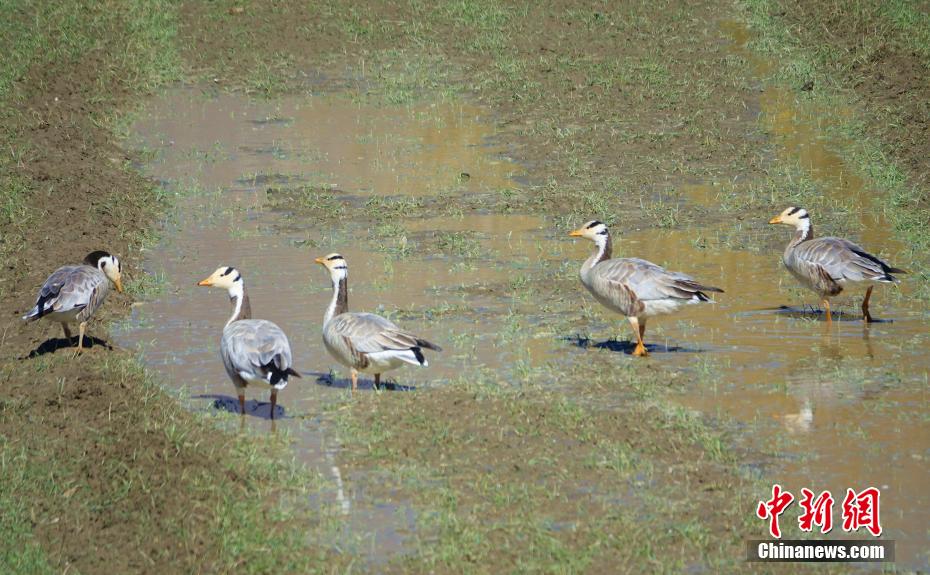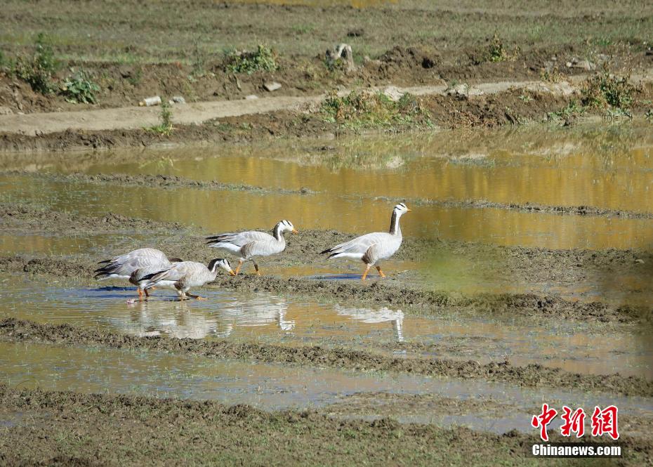 圖為11月12日,斑頭雁、赤麻鴨等鳥類在西藏山南市扎囊縣境內(nèi)的農(nóng)田內(nèi)。冉文娟 攝