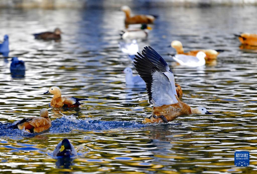 11月17日,赤麻鴨在龍王潭里嬉戲。新華社記者 張汝鋒 攝