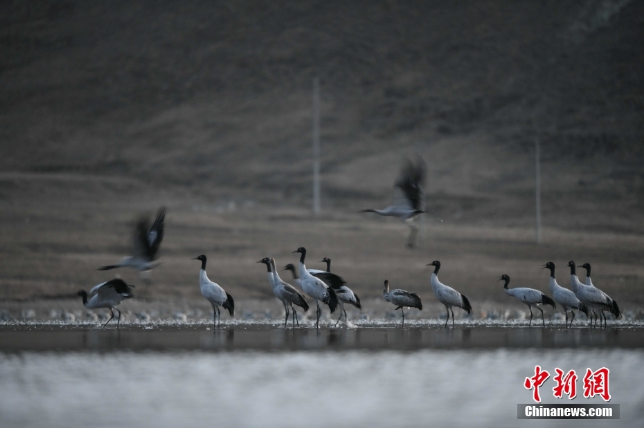 11月23日,在西藏自治區(qū)拉薩市林周縣春堆鄉(xiāng)虎頭山水庫(kù)黑頸鶴群覓食。由于適宜的環(huán)境和充足的食物,冬季的拉薩市林周縣成了越來(lái)越多黑頸鶴聚集的家園。中新社記者 貢嘎來(lái)松 攝