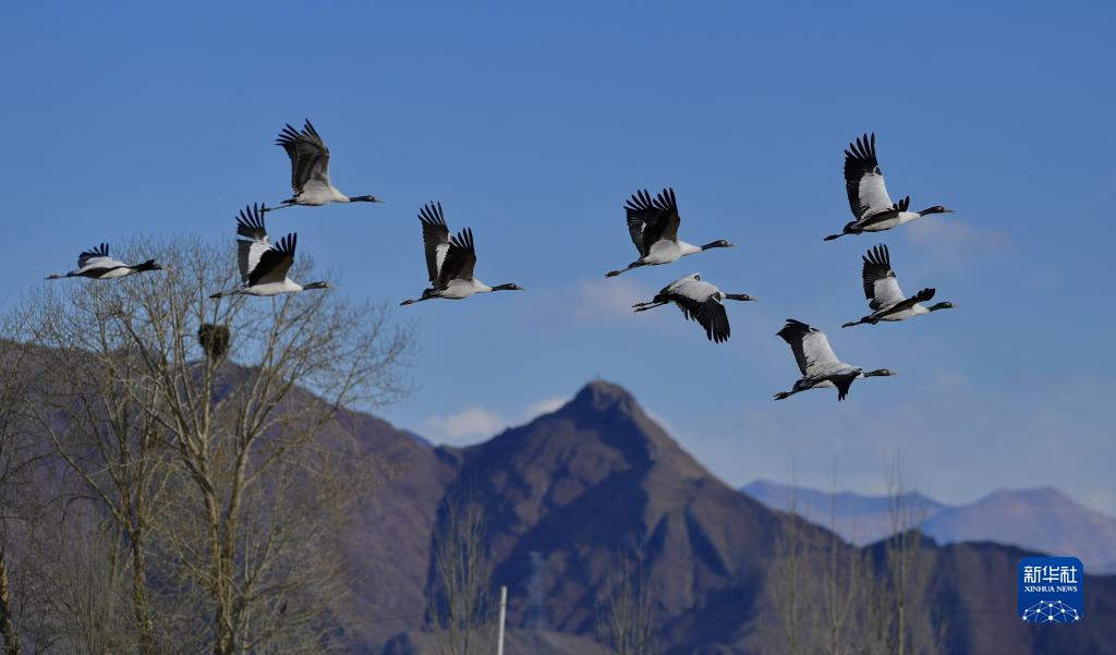 黑頸鶴在拉薩市林周縣黑頸鶴自然保護(hù)區(qū)飛翔(1月8日攝)。新華社記者 張汝鋒 攝