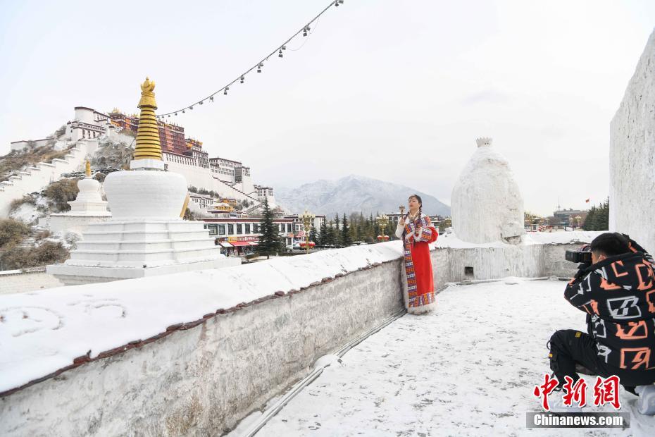 2月21日,游客穿著藏族傳統(tǒng)服飾在布達(dá)拉宮拍照留念。當(dāng)日,西藏拉薩市迎來(lái)降雪,雪后的拉薩城區(qū)和周圍群山白雪皚皚,風(fēng)景如畫。 中新社記者 貢嘎來(lái)松 攝