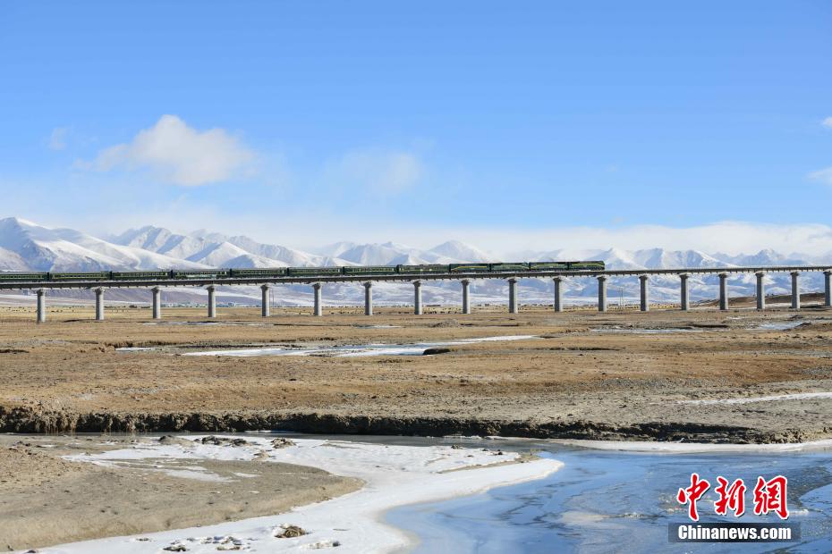 圖為一輛火車從當(dāng)雄縣阿熱濕地經(jīng)過。 貢嘎來松 攝