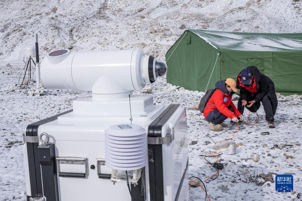 在珠峰登山大本營(yíng),科研人員給激光測(cè)風(fēng)雷達(dá)布線(4月30日攝)。新華社記者 孫非 攝